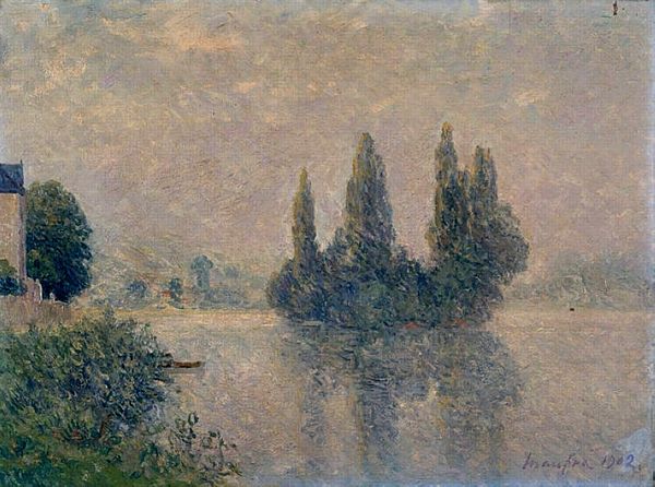 Maxime Maufra created this landscape painting using oil on canvas. Immediately, one is drawn into the interplay of light and shadow, where the brushstrokes coalesce to form a scene that feels both familiar and dreamlike. The composition is structured by the meandering river which divides the space. The water reflects the sky, blurring the boundary between earth and atmosphere. Notice how the trees are rendered with a sense of volume, yet their forms dissolve into textured daubs of paint, challenging our perception of depth and surface. The interplay between the horizontal axis of the river and the vertical assertion of the trees introduces dynamism. Maufra’s formal manipulation invites us to question the relationship between representation and abstraction. The painting does not merely depict a landscape. Instead it offers a meditation on the act of seeing and interpreting the world through the language of paint. The painting remains an evolving dialogue between the viewer, the artist, and the ever-elusive nature of reality.