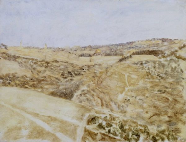 Curator: Dodge Macknight's watercolor, "Between Roofs (Lighthouse, Belle Ile)," gives us a glimpse into a scene framed by architecture, looking out to the sea. Editor: It feels like peering through a dream, doesn't it? That muted palette and the way the fields seem to vibrate with color... it's oddly calming. Curator: Macknight, an American artist, spent a considerable amount of time in Europe, becoming known for his vibrant landscapes. Belle Ile, in Brittany, France, was a frequent subject. These landscapes were of huge interest to the American market. Editor: It's more than just pretty scenery, though. The way the light hits... there's a sense of yearning, maybe for something just out of reach on the horizon. Like it's not really about the place itself but what it conjures within us. Curator: Absolutely. And, I think, by framing the view as he does, we get a sense of a lived space, an everyday life, rather than just a picturesque vista for the tourist gaze. Editor: Well, it makes me want to grab my paints and chase a similar kind of light myself. Curator: It is an inspiring work, and hopefully allows us to consider a space and time outside our own.