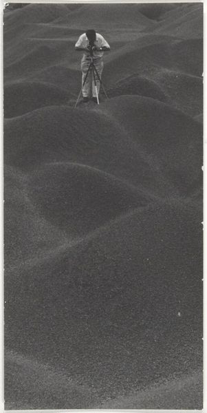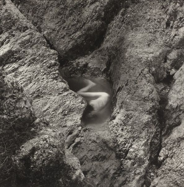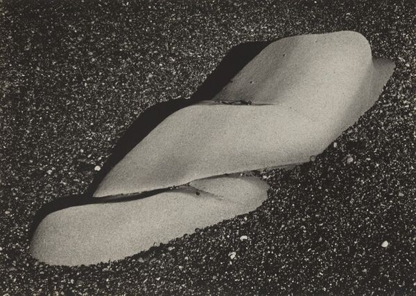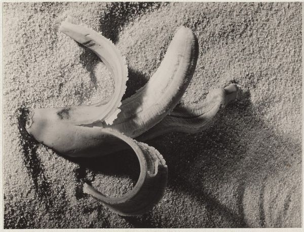 Editor: Robert Frank’s 1941 gelatin-silver print, "Banana in Sand--Design," is intriguing. There’s a sort of desolate beauty in this abandoned banana peel against what looks like a blank expanse of sand. What do you see in this rather unusual still life? Curator: For me, it's about Frank finding unexpected poetry in the mundane. He zeroes in on a discarded banana peel, elevating it, transforming it into a study of form and shadow. The gritty texture of the sand is just as important as the banana itself. What’s interesting to me is how he makes the impermanent permanent, freezing this transient moment in time. Almost like a visual haiku. Editor: That’s a gorgeous reading of it. The "visual haiku" bit really stuck with me. Do you think that by removing the typical vibrancy of color – by rendering it in monochrome – Frank is trying to guide our gaze specifically toward shape and texture? Curator: Absolutely! He’s stripping away the familiar to reveal something deeper, almost raw. It’s as if he is whispering: *Look closer. Find beauty in the forgotten. Don’t let it slip by.* Photography in general has that superpower, doesn't it? Capturing time, revealing little overlooked details in a hyper-real way. This aesthetic is a quiet rebellion against traditional portraiture. A way of discovering significance where others saw trash, perhaps. Editor: I’d never considered the rebellious element before. It makes me appreciate the image so much more, this refusal to conform to expectations. Curator: Precisely! Art thrives in the space between what is and what could be. It pushes boundaries, shakes us awake. Looking closely at this photograph has helped us both view familiar objects anew. What a wonderful rediscovery of something seemingly insignificant.