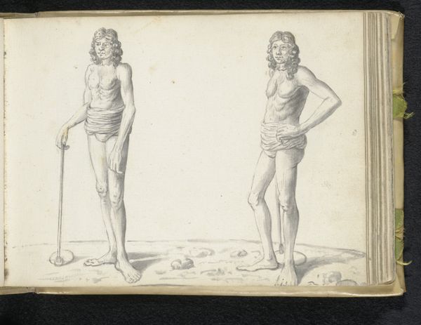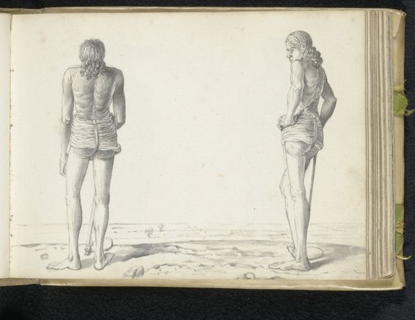 Esaias Boursse created this graphite drawing, “Two Labourers,” to a height of 148 mm and width of 196 mm. The composition presents two standing figures, likely labourers, rendered with a stark realism. Boursse meticulously captures the anatomical details, with shading delineating muscle structure and bone. The lines are economic and precise, emphasizing the contours of the body, while their positioning, with hands on hips, conveys a sense of casual confidence. The labourers' clothing, draped and wrapped, hints at a classical influence, perhaps alluding to ancient ideals of the male form and civic duty. The tonal values in the drawing, ranging from light to dark, create depth and volume, highlighting the play of light across the figures' bodies. The semiotic significance might stem from its challenge to the established aesthetic norms. The detailed rendering and thoughtful arrangement function not merely as observation but contribute to a larger discourse about representation, labor, and the human condition.