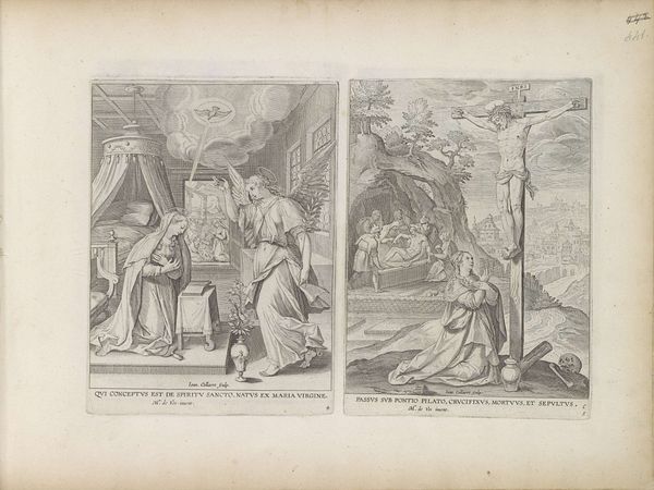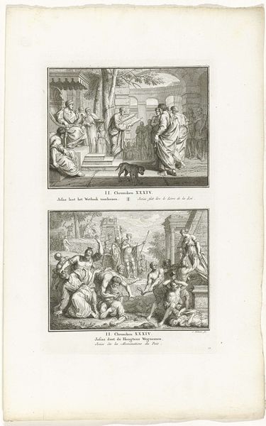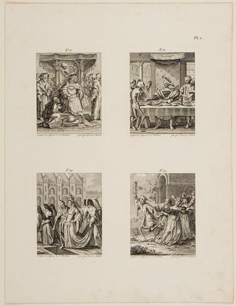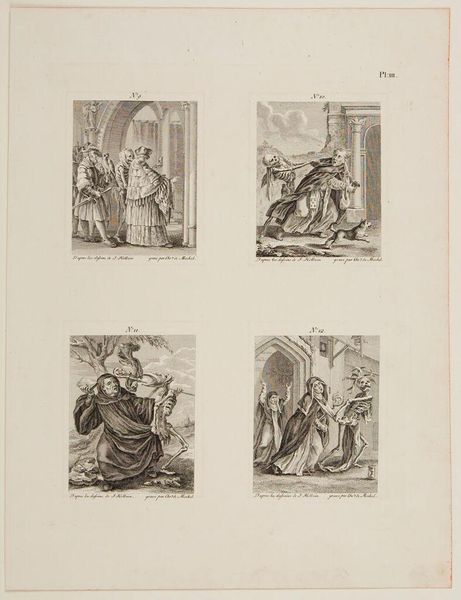 Curator: This is Christian von Mechel's "Plate Five of Triumph of Death, Triumph of Divinity, Triumph of Poverty." The stark monochrome imagery really sets a somber tone. Editor: The method of production is particularly interesting here. The crisp lines suggest a printmaking process, likely engraving or etching, emphasizing the material and repetitive nature of the work. Curator: Indeed. Notice how von Mechel uses line weight and density to create depth and texture, contributing to the overall narrative structure within each of the four scenes. Editor: And what a narrative! It seems to be highlighting the pervasiveness of death across different social spheres, from religious institutions to scholarly pursuits. The social critique is palpable. Curator: The compositional balance is also notable. Each vignette is meticulously framed, directing our gaze and building a symbolic hierarchy, wouldn't you agree? Editor: I do, and I’d add that this piece underscores how even the most revered figures are subject to material decay and the levelling force of mortality. Curator: A truly compelling example of how form and content can converge. Editor: Agreed, a fascinating look at labor and mortality.