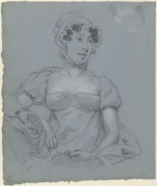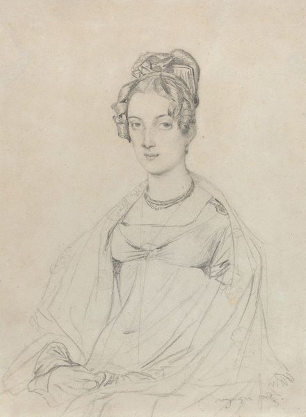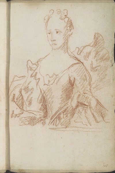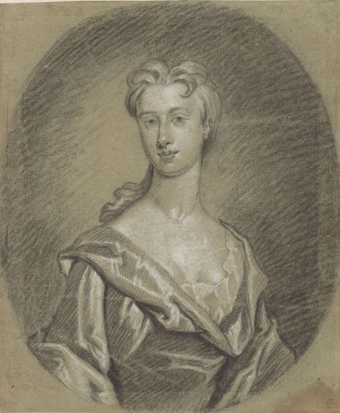 Curator: It's Petrus Johannes van Reysschoot’s “Portret van een vrouw,” dating to the period of 1710 to 1772. Done in pencil. Editor: Oh, she looks... uncertain. Like she’s trying to decide whether to scold me or offer me tea. It's all sketched out so lightly; you can almost feel the artist hovering over the page. Curator: Well, the baroque portraiture favored that air of subtle drama. It’s more than just capturing a likeness; it’s about hinting at character. That oval format is so interesting, it almost echoes ancient Roman portrait busts but softens it. Editor: Baroque drama, got it! But tell me, what’s with the landscape peeking behind her? It’s barely there, all scribbles, but still part of the picture. It makes her feel…unmoored, somehow. Curator: Precisely! Those background elements served a purpose beyond mere scenery. Consider the classical ideal merging with the immediacy of nature—order with wildness. Editor: I do love wildness! The way he rendered her dress gives it so much texture, that draped cloth around her feels like it wants to break free from the edges. You could almost pluck it from the image. Curator: You have a good eye. It emphasizes the contrast of the face with this softer baroque treatment to the dress and nature surrounding her. Consider it as an embodiment of societal ideals about womanhood during this time. Editor: So she's got her face on, ready to face the world, and her robes practically falling off! She’s literally holding it all together in one brooch and bow? Fascinating. Makes me wonder who *she* really was, and who she was playing at being. Curator: And perhaps the pencil sketch contributes to that ambiguity. Is this a study, or is this intended as its final state? The subtle gradations in shading imply refinement, not casual effort. Editor: Either way, I like it. There's something very vulnerable and human in this sketchy form, even amidst all the expected theatricality. I could imagine getting lost in those half-formed bushes for days... Curator: It really prompts a meditation, doesn’t it? The drawing encapsulates something very vital: that enduring negotiation between persona, role, and reality.