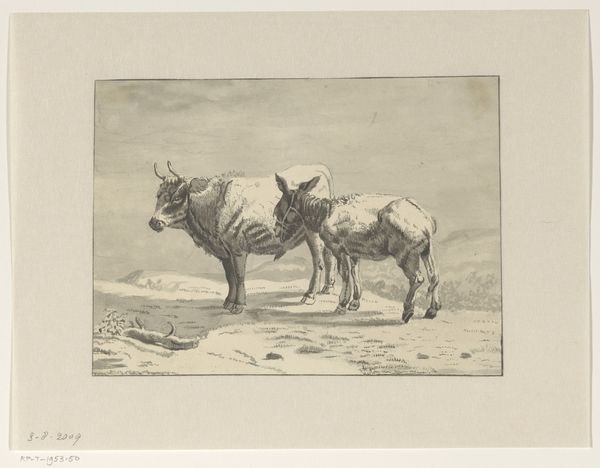 Armand Collard etched “Two Donkeys on the Beach” on paper sometime in the late 19th century. Note how the composition is neatly divided into zones: the light sandy foreground, the flat expanse of the sea, and the muted sky above. Collard plays with scale and perspective, placing one donkey prominently in the foreground, casting a shadow, while the other is a mere silhouette in the distance. The scene evokes a sense of melancholy. The use of etching allows for detailed linework, especially noticeable in the texture of the donkeys' coats and the subtle gradations of tone in the sky and sand. Consider how the artist disrupts traditional landscape expectations by focusing on these animals. This challenges our conventional understanding of beauty, prompting us to see value in the mundane. The stark simplicity of the scene, combined with the delicate etching technique, invites a reflection on nature and representation.