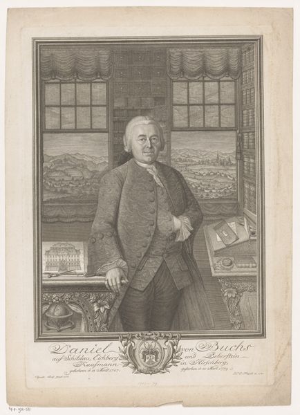 Editor: This is Johann Martin Bernigeroth's 1754 engraving, "Portret van Carl Friedrich Hundermark," currently housed at the Rijksmuseum. It’s got such a formal feel, almost staged. He's holding papers and pointing, surrounded by these academic props... What's your read on this piece? Curator: Oh, portraits from this era were always about constructing an image, weren’t they? Bernigeroth wasn't just capturing a likeness; he was building a persona, carefully curating symbols of intellect and status. Notice how the light catches the quill pen, highlighting the act of writing, of creation itself. Editor: Definitely! And the pillar in the background, suggesting classical architecture? It all speaks to a certain… grandeur. Was that typical of portraiture then? Curator: Absolutely. Think of it as 18th-century LinkedIn! It's a visual CV intended to impress. The Baroque flair adds drama, but the precision of the engraving keeps it grounded in a kind of academic realism. Though I wonder what Carl Friedrich himself thought about it... Did it truly capture *him*? Or just an idealized version? Editor: That’s a great point. Maybe the *real* Carl Friedrich was a total goofball! Still, even the attempt at capturing an ideal reveals so much about the values of the time. It makes you wonder what image we're all trying to project today... Curator: Precisely! Art's not a mirror reflecting reality, it's a hall of mirrors reflecting desires and aspirations, don't you think? This portrait makes me ponder the fleeting nature of ambition, and the surprisingly durable power of printed images. Editor: I hadn’t considered that angle before. Thanks, I learned a lot today!