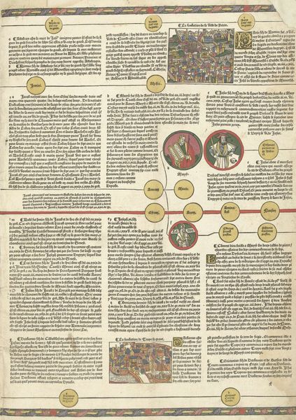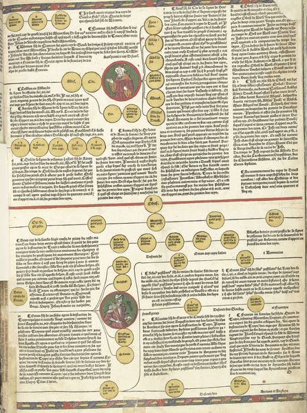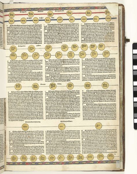 Curator: Here we have a page from the *Cronica Cronicarum (...)*, specifically *blad 9 verso*, possibly printed between 1521 and 1529 by an anonymous creator. Editor: My initial impression is one of organized chaos. It looks like a medieval attempt at information design. All that dense text, broken up by simple graphics. It seems both intimidating and strangely beautiful. Curator: It certainly reflects the era’s approach to historical record, doesn't it? The *Cronica Cronicarum* was an attempt to create a universal chronicle, weaving together sacred and secular history. This specific page, and indeed the entire book, would have been highly influential, shaping understandings of the past and legitimizing power structures. Editor: Absolutely. I see the parade of figures along the top – each one carrying symbols of their authority or martyrdom. Swords, books, croziers... The book layout imitates and even disseminates that authority. This imagery creates a direct connection between the textual content below and the figures, effectively legitimizing both. What can you tell me about the visual program more broadly? Curator: Well, the structure adheres to medieval scholastic tradition: presenting information in a hierarchical, interconnected manner, aiming for comprehensiveness. The use of the same image style emphasizes a claim to unified and objective truth, so that all knowledge may fit into a singular narrative. Editor: But doesn't this orderly facade mask a whole mess of conflicting beliefs? To me the format suggests an anxiety that, without proper structure, chaos would reign supreme, undermining that claim. Curator: A very valid point! In a time of significant political and religious upheaval, attempts like the *Cronica Cronicarum* can be seen as desperate acts to preserve stability in the face of uncertainty. Editor: Indeed. Thank you! Examining such imagery, the ordering and representation of time and power gives this page more than textual insight. It conveys much about how past cultures navigated uncertainty. Curator: A potent reminder of art’s engagement with, and influence on the formation of collective identities.