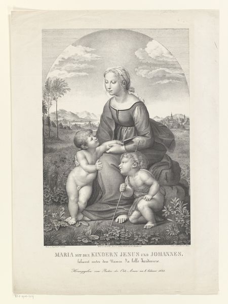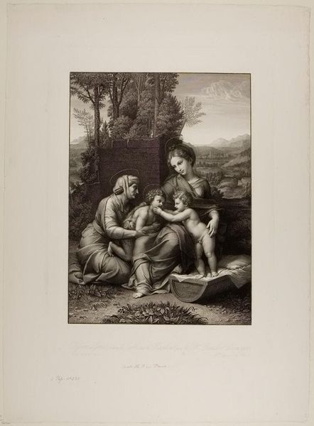 Curator: This is Pietro Anderloni's "Virgin in the Meadow," a plate measuring about 50 by 35 centimeters, currently housed at the Harvard Art Museums. Editor: It’s strikingly peaceful. The figures are arranged in a soft, almost pyramidal composition that lends a sense of stability. Curator: Absolutely. Note how Anderloni reproduces the familiar Madonna and Child iconography, setting it within a pastoral landscape, invoking themes of innocence and divine protection. Editor: Yes, the lines are delicate, creating a serene, ethereal quality. It's interesting how the halos, rendered so subtly, serve as visual anchors, drawing the eye. Curator: Halos have always symbolized divine illumination, marking these figures as sacred, transcending the earthly realm within that idyllic backdrop. And the staff held by the child alludes to the cross and future sacrifice. Editor: It's a compelling blend of classical structure and subtle symbolism. The tonal gradations are so fine. Curator: It invites us to reflect on the enduring power of religious imagery and its capacity to evoke deep emotional responses. Editor: A testament to the artist's skill. There’s much to admire.
