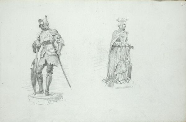 Curator: Before us is John Singer Sargent's "Study of Six Figures," a pencil drawing from around 1869 to 1871. Editor: My first impression is how ethereal these figures are. It feels like glimpsing a dream, a memory, rendered in delicate lines. Curator: Exactly. Sargent, though later known for his society portraits in oil, honed his skills with sketches like these. Consider the materiality of pencil on paper: it’s a direct, accessible medium, indicative of the artistic process, revealing the artist's hand at work. Editor: I see the artist's hand but what was he seeing in his mind's eye? Look at the figures dressed in historical garb; what role did theater or historical reenactments play in inspiring such costumes at this moment? Did Sargent see the art world moving back towards traditional craftsmanship in reaction to the Industrial Revolution, perhaps? Curator: Good question. This drawing could be seen as part of a larger artistic engagement with history and identity, both in Europe and the United States, shaped by historical revivals in design and fashion and driven in part by nationalistic and imperialist fervor. What impact would images like these have on contemporary political and social discourse, where anxieties surrounding the commodification of labor and artistry was commonplace? Editor: Right. We also can’t ignore the way academies shaped the very concept of art and its dissemination. These sketches showcase Sargent's grounding in academic tradition—studying the human form, mastering line and shadow. Yet he seems also interested in fleeting expressions, rather than perfectly rendered bodies. How did that shape how such art would have been displayed in salons or circulated as prints at the time? Curator: Perhaps such artwork's accessibility as sketches underscores his innovative genius. Sargent's work, including these "idea generation" studies, provides a crucial lens through which we can view the intersection of artistic labour, the materials used, and cultural production during a transformative period. Editor: And it invites us to consider the power of the sketched image, both in its historical context and its continuing resonance today. It seems relevant that the drawings would be accessible and inexpensive because it shows how society’s fascination with persona and dress goes all the way back to at least the renaissance period. Curator: It certainly adds layers to how we see the function and role of image making today. Editor: Indeed. A valuable piece in piecing it all together.