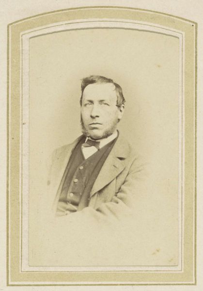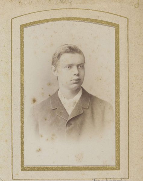 Curator: Up next, we have an early gelatin silver print portrait titled "Portret van een jonge man," created anonymously sometime between 1863 and 1900. Editor: Immediately, I notice a delicate melancholy in the young man's gaze, intensified by the subdued tones of the gelatin silver print. It’s so formally composed; what can we read into the way he presents himself to the camera and the implied audience? Curator: The subtle gradations in light and shadow really accentuate the texture of his suit and tie, adding to the depth. Note the very fine details, particularly the lighting on his brow—there is an emphasis here on classical portraiture. Editor: Certainly, and in looking closer I wonder what constraints, both personal and societal, influenced his portrayal? Did this young man have any say in his own representation, and is this the person he wanted to project? These are crucial questions when dealing with historical images like this. Curator: It seems reasonable to argue the sitter followed the accepted conventions, in which dress, posture, and overall composure underscore societal position. Editor: I agree to a degree, but isn't there something defiant about the faint tightening of his lips, like he’s withholding something? Given photography’s role in early sociological documentation, his guarded expression resists complete categorization. How can the act of witnessing this resist? Curator: I would suggest the framing, with the elegant, if minimal, gold border around the image works to elevate this subject. I feel its success lies in balancing social requirements and personal, even slightly uncertain presentation. Editor: Precisely. It presents so much without telling all, reminding us how the medium evolved. Curator: Yes, and for that reason, among others, it remains potent as both document and art object. Editor: Agreed. And in interrogating history, these subtle elements invite richer and ultimately critical dialogues, even to this day.