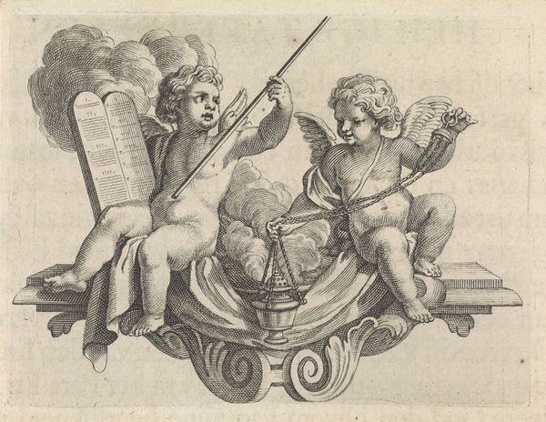 Jan de Goeje made this ornamental design with two playful putti in 1770 using pen and brown ink, brush in grey and watercolour. The delicacy of the pen work and the fluid washes of color speak to the artist's mastery, the material qualities enhancing the overall effect of lightness and grace. It’s important to remember that the use of paper and pigments like watercolour wasn't always common, as they became widely available only with the rise of industrial production. De Goeje created this design within a larger social and cultural context. Ornament served as a means of conveying status and sophistication, yet also served an important role in democratizing artistic expression through printed media and drawing classes. It represents the increasing commodification of art and design, reflecting broader shifts in labor, taste, and consumption during the 18th century. Ultimately, this work invites us to look beyond traditional notions of fine art. By examining its material composition, artistic process, and historical context, we can appreciate the intricate relationship between art, craft, and design.
