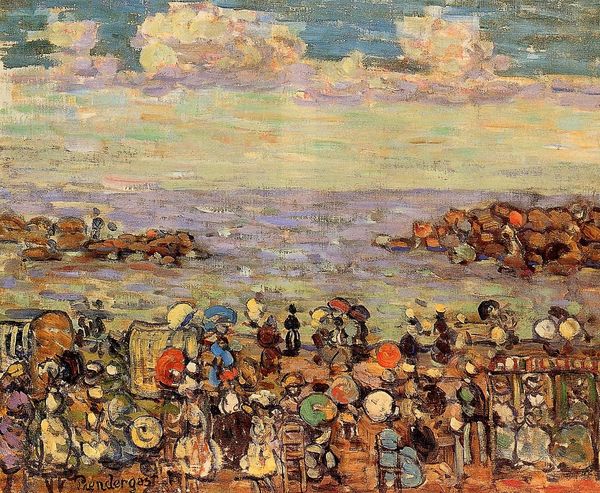 Editor: This is Maurice Prendergast's "Holiday in New England," painted around 1910 or 1911, using watercolor. It depicts a lively beach scene. The figures seem almost sketched, very free and light, almost weightless. What’s your take on this piece? Curator: Well, if we really look into the materiality of this watercolor, we see a democratization of art production happening. Prendergast, while working within impressionistic modes, employed a medium, watercolor, and a genre scene to capture this "holiday." It highlights a burgeoning middle class experiencing leisure. Consider the socio-economic implications – who had access to these coastal vacations, to the clothing depicted, to the very act of observing and representing it? Editor: That’s a fascinating point. I hadn't thought about access to materials in that way. Do you see that impacting the style? Curator: Absolutely. The immediacy of watercolor, its relative affordability and portability compared to oils, speaks to a different artistic practice. It allowed Prendergast to quickly capture fleeting moments, to document a changing society marked by increased consumption and leisure activities. Observe how the visible brushstrokes, almost childlike in their application, belie a more considered process, inviting us to ponder not just what is shown, but how it was made, and who could participate in its creation and consumption. Are these forms carefully stylized to reflect that labor and ease? Editor: So it's not just about pretty colors but about understanding who could make this, who is represented and who is doing the representing... Wow, there is a lot to unpack about this piece, even in its casual appearance. Thanks! Curator: Precisely! Looking at the art's production and context truly enriches the viewing experience.