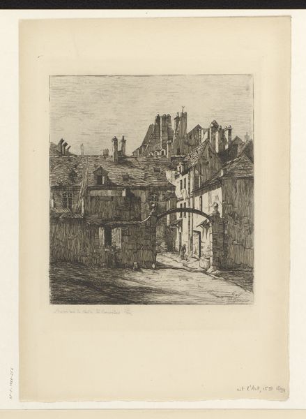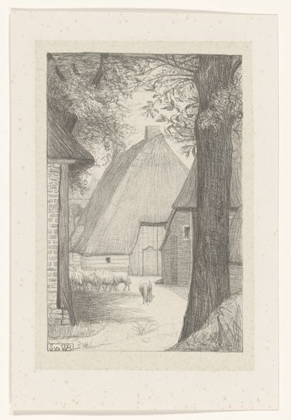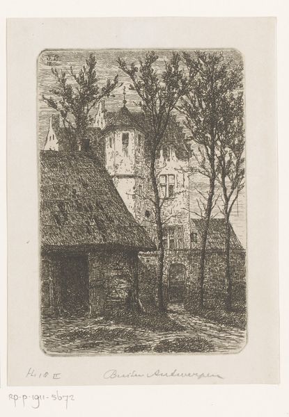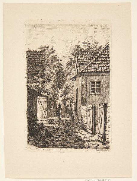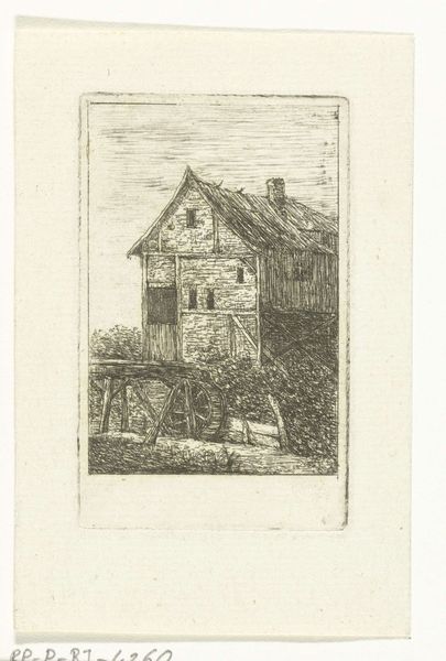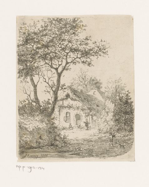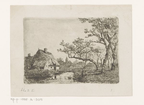 Curator: Looking at this etching by Jean Pierre François Lamorinière, "Gezicht op een rietgedekte hoeve", created sometime between 1838 and 1888 and held here at the Rijksmuseum, I'm immediately struck by the density of detail he's achieved with etching alone. Editor: Yes, there’s a stillness to it. Almost like a dream, a glimpse of some enduring folk memory of rural life. The texture is lovely; it really invites you in. Curator: I agree. Lamorinière really captured the feeling of a humble dwelling. The thatched roof itself speaks of generations and time-worn techniques. It projects shelter. Editor: Indeed, and note how he juxtaposes this stability with that starkly bare tree; its fragility mirrors something about our own fleeting existence compared to the home as refuge. Do you see how its branches are so light, ephemeral? The contrast with the home gives it more gravity. Curator: It certainly invites multiple readings. What intrigues me, beyond the immediate image, is understanding this etching in the context of increasing urbanization in the 19th century. It suggests a deliberate return to more simplified forms, reflecting nostalgia about what they’re losing. Editor: A potent political and cultural symbol in that way. Perhaps these thatched roofs become symbolic of a traditional way of life threatened by industrial advancement, acting almost like resistance. Curator: Precisely, it begs to question for whom he originally made this? What circles circulated such prints in that era of radical transformation, for city-dwellers yearning to preserve fading rural aesthetics? Editor: Looking closely, you begin to feel the physical weight of tradition through his mastery of the medium. It seems we are more eager to seek, recognize and represent things only at the cusp of losing them altogether. Curator: Ultimately, Lamorinière's "Gezicht op een rietgedekte hoeve" goes far beyond a simple landscape depiction to embody longing for an untouched past, while speaking volumes about social upheaval. Editor: Beautifully put. I now walk away thinking not only about that simple house but its powerful place within historical narrative about how change shapes the human heart.