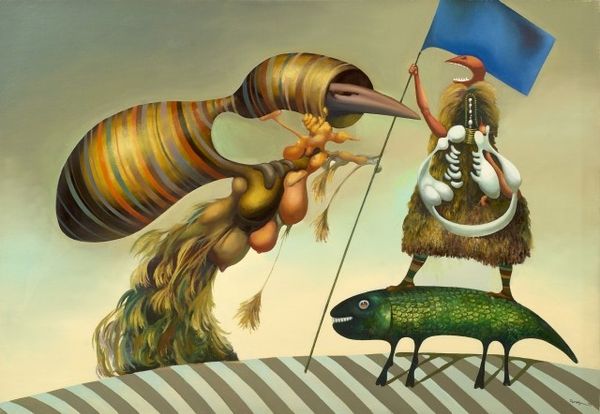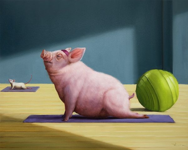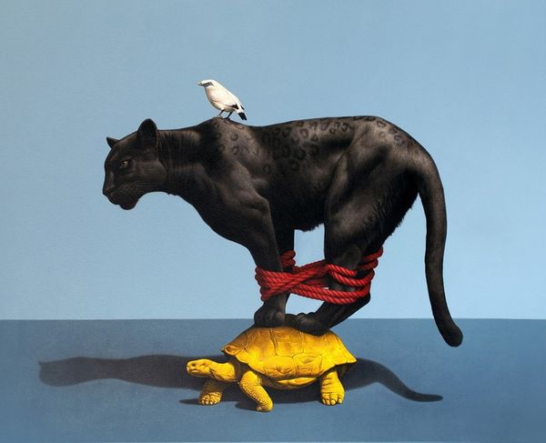 Editor: So here we have Lucia Heffernan’s painting, "Summer Stroll." It looks like an oil painting – and I'm immediately struck by how whimsical it is. What's your take on this piece? Curator: Whimsical is the perfect word! It's that surprising juxtaposition of the everyday with, well, a pig on a scooter. For me, Heffernan is inviting us to see the world through the fresh, unjaded eyes of childhood, isn't she? Do you feel that initial shock melts into a more profound feeling? Editor: I think so, the more I look at it. It's so expertly done, so realistic, it almost tricks you into accepting the impossible! Curator: Precisely! The realism grounds the fantasy. It makes you consider: what if a pig *did* ride a scooter? What if that *was* ordinary? There is something deeper here, a subtle nudge towards questioning our preconceived notions. What are some thoughts on the presence of the other animals here? Editor: Well, they don't seem as surprising, perhaps because there are more animals near people usually! The composition itself almost follows portrait rules – animal portraiture perhaps. I do love how the shadow of the fence plays on the pavement and across the chicks; but, to be honest, I'm still just charmed by the pig! Curator: Ah, yes, but beyond charm? It makes me think of those old fables where animals represented human characteristics. Is the pig a comment on society, perhaps? The pursuit of simple pleasures? Maybe Heffernan's inviting us not to overthink, but just to enjoy the 'stroll'. What do you think about that? Editor: That makes sense. I guess I came in expecting it to be lighter, but it is clever in how it plays with perception, even forcing you to contemplate possible meanings if you like. Curator: Exactly. And isn't that the joy of art? The layers of meaning, the invitation to question, and yes, sometimes, just to be utterly charmed!
