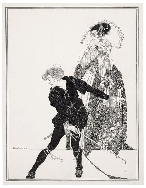 Editor: This is Aubrey Beardsley's "John and Salome," a striking drawing. I'm immediately drawn to the stark contrast between the figures' garments. What symbolic weight do you think the artist intended to convey with this sharp black and white division? Curator: The contrasting garments are indeed key. Beardsley often played with binary oppositions – male/female, sacred/profane. Notice how Salome's elaborate headdress references archaic power, while John appears cloaked in somber restraint. Editor: So, the visual language reinforces a power dynamic? Curator: Precisely. Salome's gaze, the floral motifs entwined with her gown, speak to a seductive, perhaps dangerous, feminine force. Think about the cultural memory associated with Salome; does Beardsley reinforce or challenge it? Editor: I see, it's a visual dance between tradition and reinterpretation. Thanks! Curator: Indeed. Symbols are never static, their meaning evolves. A fruitful observation!