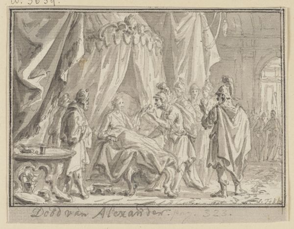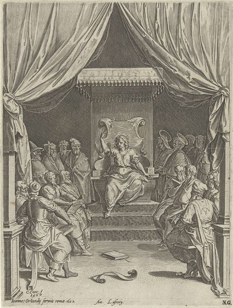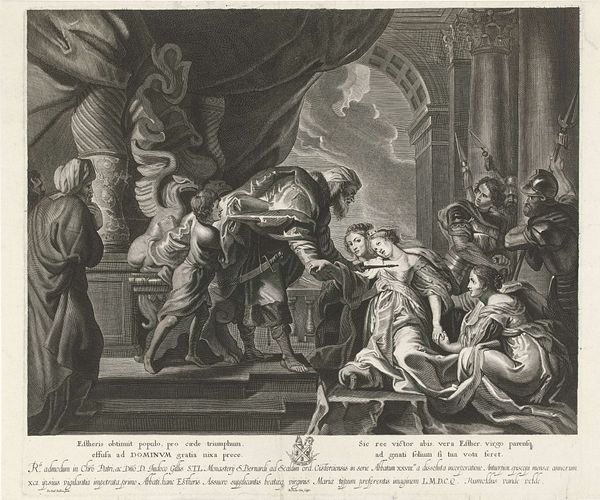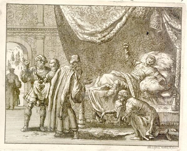 Editor: This etching by Gabriel de Saint-Aubin from 1752, entitled *Reconciliation of Absalom and David*, portrays quite a tense moment, wouldn’t you agree? I find the stark lines and dramatic postures very striking. How do you read the symbolism in this image? Curator: Indeed, the artist captures a powerful emotional tableau. Look at how Saint-Aubin renders David enthroned, almost rigid. What figures of authority typically surround him? Who stands behind David, monumental as an antique bust, yet devoid of any human sentiment? And, conversely, how is Absalom depicted? Editor: He’s kneeling, nearly prostrate, and appears very vulnerable. I see how the image draws on archetypes… David is powerful and unforgiving, and Absalom is humbled and desperate. Curator: Exactly. Consider the historical weight these characters carry, figures from the Old Testament who stand for power, rebellion, and reconciliation. What emotional weight do you see embedded in such depictions, which might also appear in depictions of family strife and political power in 18th-century France? Think about how these archetypes might tap into shared cultural narratives across time. Editor: I hadn't considered the connection to the artist’s contemporary context, but now that you point it out, it makes perfect sense that he would have selected a highly symbolic image of authority in conflict, loaded with shared understanding about power, forgiveness, and reconciliation. Curator: It is fascinating to see how an artist uses inherited visual vocabulary to speak to their own time, layering new meanings onto older narratives. Editor: This has really changed how I see this piece. I was so focused on the immediate drama of the image, I missed all these layers of cultural symbolism! Curator: Recognizing symbols helps us decode cultural memory and the continuous dialogues between past and present.