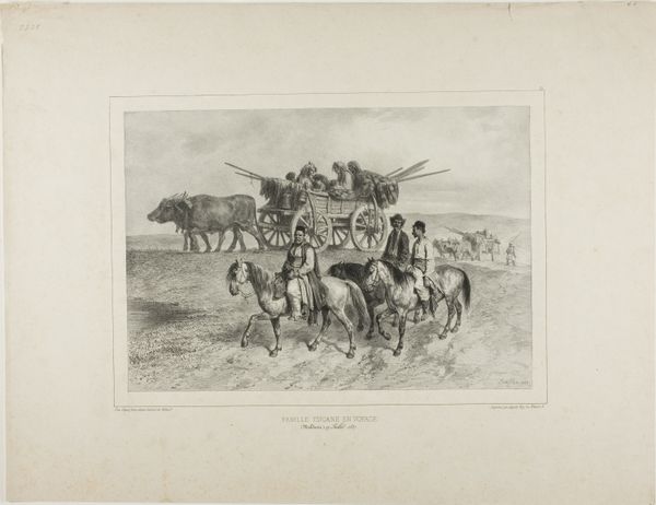 Editor: We’re looking at “Don Quixote's Homecoming from his Second Expedition,” an 1880s lithograph by Adolph Kittendorff at the SMK. It’s monochrome and full of movement. There's a real sense of weary travel to it all. What stands out to you? Curator: Oh, absolutely. It's funny how this landscape, even in shades of grey, feels sun-baked and vast. For me, the genius lies in Kittendorff's understanding of *procession*. A group moving through space… it's always ripe for storytelling. How does he visually communicate the story in this single print? He has the exhausted animals, the distant mountains... Are they a reflection of Quixote's own internal landscape, do you think? Editor: That's an interesting point! It definitely makes you think about the burden that’s carried, both physically and perhaps mentally, after an adventure like Don Quixote’s. Curator: Exactly. The world constantly mirrors us. Speaking of burdens, look at how the lithographic process, traditionally used for mass production, is almost acting as a form of "weight" in the artistic telling of a well known story. Mass production allows the adventure to be both widely shared yet also slightly cheapens its individual experience for each reader/viewer. It feels right, doesn't it? How this work so eloquently expresses the return from fantasy back into the realm of… well, regular life? Editor: Yeah, I see that now! I hadn’t thought about it in that light at all. The medium definitely adds another layer to the interpretation. Thanks! Curator: My pleasure! Art's best when it's a dialogue, wouldn't you say? Now, what other dusty corners of perception can we sweep out?