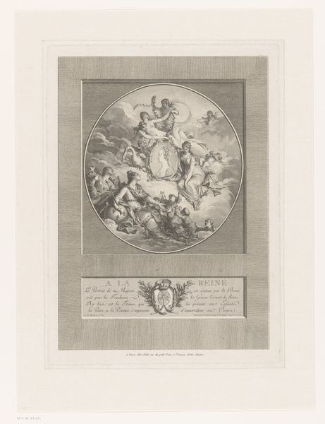 Curator: The Rijksmuseum holds this striking medallion print titled "Medaillon met portret van Lodewijk XVI van Frankrijk omringd door Justitia, Wijsheid, Overvloed en Waarheid," created in 1774 by Noël Le Mire. What are your initial impressions? Editor: It's dense. So many symbolic figures packed into that circular frame. The stark monochrome intensifies the drama—a very loaded image, I'd say. Curator: Indeed. As an engraving, the process demands meticulous labor, carefully transferring an image through a matrix onto paper, which in this instance constructs the propaganda surrounding Louis XVI early in his reign. It also speaks to broader trends, the commodification and consumption of images bolstering political power. Editor: Right. The imagery is fascinating considering what's to come. The personifications of Justice, Wisdom, Abundance, and Truth are interesting choices surrounding a portrait of Louis XVI. What’s particularly curious is its context, the image acting as a promise of what his rule could embody for the people. It served as a very public image, given its creation as a widely-distributed print. Curator: Precisely. This wasn’t a unique art object, meant for private contemplation; this was made for circulation, to reinforce specific notions about kingship, circulating among different strata of society through various venues such as print shops and public display. Think about the physical labor—the skilled artisan carefully wielding tools to carve and reproduce images aligned to Louis' envisioned reputation. Editor: I’m curious about how the classical imagery worked to support Louis XVI. Allegorical representation, like Justice, communicates complex ideological meanings through a codified vocabulary accessible to those within court circles and also, to a degree, more widely. But even still, was this visual language truly effective in shaping public opinion, given looming economic and social unrest? Curator: We can analyze how printmakers mobilized visual culture for political legitimization through repeated forms, contributing to the construction, the manufacturing, of a public persona for the King of France, even as socio-political undercurrents pointed toward massive future upheaval and revolt. It highlights how the production of this single object had broader implications within the regime of representation itself. Editor: It serves as a potent reminder of art’s entanglement within the political fabric of pre-revolutionary France. Considering how it all ended, there's a deep irony here that makes you consider the real power such portraits wield. Curator: I agree. The image operates almost as a social artifact, its composition of forms hinting at deeper societal fault lines beneath this royal projection. Editor: I’m taking away the precarity of power and imagery from this piece.
