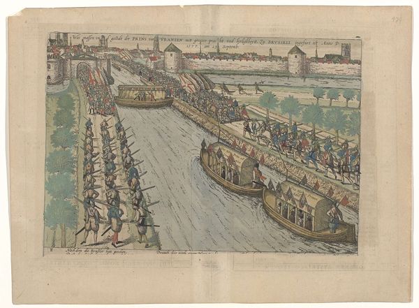 Curator: This is Frans Hogenberg's "Inname van de schans IJsseloord bij Arnhem, 1585," an etching and engraving made around 1588. It's currently held at the Rijksmuseum. Editor: What strikes me is the sheer density of information. The artist's use of line creates a field of action. It feels almost like a map, detailing every soldier and ship, collapsing space and time into a single plane. Curator: Indeed. These prints were not merely decorative; they served a vital role in shaping public perception of current events. The depiction of the siege of IJsseloord offered a perspective on the Dutch Revolt against Spanish rule, a pivotal moment in Dutch history. The composition teems with symbolism: the fortified structure, the ships in the river, the charging soldiers. Each element speaks to the larger narrative of conflict and resistance. Editor: Absolutely. And notice how the artist organizes chaos into comprehensible order. The opposing forces are carefully delineated, creating visual rhythms across the page. Color, applied selectively, also aids this purpose, perhaps representing different allegiances or outcomes. The etcher’s command over the medium is evident in the textures and varying line weights. Curator: Consider the psychological impact. It’s not just a record of facts; the artist evokes a sense of intense struggle. Flags function almost as characters, communicating not only identity but ambition and territorial desires. They guide your eye across the composition, punctuated by billowing gunpowder clouds which represent the chaos and drama inherent to war. Editor: What endures is this tension between precise observation and stylized rendering. Each soldier is identifiable, yet collectively, they dissolve into an abstraction, underscoring the dehumanizing aspects of war itself. Hogenberg compels you to dissect his visual field. Curator: Seeing this work reminds us of how images have long served as powerful tools for communication and remembrance. These prints were key components of news dissemination in an early, globalized world, each battle serving a larger call for identity. Editor: Agreed. There’s something deeply compelling about experiencing an historical record reframed by design itself, even after all this time.