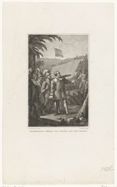Editor: This is “Slavenhandel,” or Slave Trade, an engraving from somewhere between 1758 and 1829, housed here at the Rijksmuseum, by Theodoor Koning. The detail is incredible, but the scene is really disturbing; a man is being exchanged between two European traders. What strikes you most about this work? Curator: Well, first off, that ornamental border! It frames a horrifying reality with…almost a sense of Baroque celebration. Don't you think? That tension hits you right away. It's a gut punch framed in pretty paper. It’s not just the transaction itself but the composed nonchalance around it; other people are in the background like the man's body is something like cloth, right? Editor: Absolutely. It feels deliberately jarring. Were prints like these meant to inform, or to persuade? Curator: I'd wager both. Prints were, pardon the pun, instrumental, spreading abolitionist ideas alongside straightforward record keeping. See the ship in the background? And those men trading the slave on the coast? Imagine a 17th-century meme – shocking imagery circulated widely to fuel discussion and, hopefully, action. How effective were those prints like “Slavenhandel”, after all? Editor: I see what you mean, circulating to start discourse... Looking at the body language in the work itself makes you feel… things. Thank you so much, this was eye-opening, especially considering what prints meant to circulate news. Curator: My pleasure. Art’s power lies, I think, in turning seeing into feeling, which could be so much more productive in turning our future discourse.