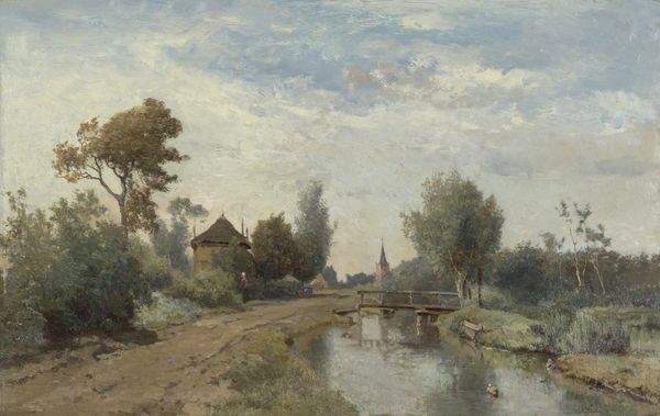 Alfred Sisley, a British artist working in France, painted 'Summer in Moret' using oils to capture a serene scene. This image shows a particular moment in French history. The late 19th century saw the rise of the Impressionists, who challenged the academic art traditions. This artistic movement coincided with broader social changes, including urbanization, industrialization, and shifts in class structure. Sisley's landscapes, like this one, often depicted the French countryside as a space of leisure and recreation, but avoided dealing directly with industrial growth. The scene is constructed through visual codes with the interplay of light and shadow, reflections on the water, and the loose brushstrokes that characterize Impressionism. The play of natural light and the changing atmosphere, captured with quick, broken brushstrokes, suggest a fleeting moment in time. To understand Sisley's work fully, it's vital to look at exhibition reviews, artist biographies, and other historical documentation to grasp how the artistic environment shaped Sisley's artistic vision and contributions to modern art.