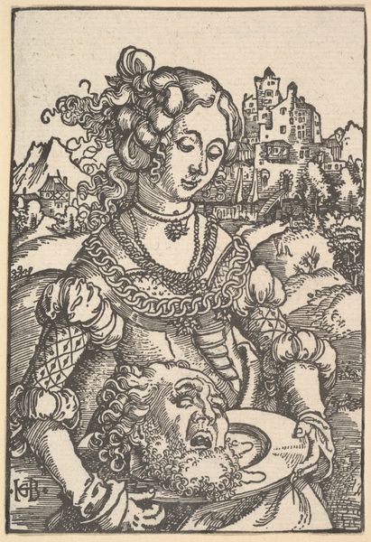 This is 'Intemperance, from Vice and Virtues,' a print made by Heinrich Aldegrever around 1528. This small, intricate work presents a compelling visual study in contrasts and moral allegory. The composition is dominated by a central female figure, her gaze averted downwards, almost ashamed, while she is draped with a snake and a goat, symbolizing uncontrolled desires. The artist masterfully uses the medium of engraving to create contrasting textures, from the soft rendering of skin to the coarse hair of the goat. The background features a stark division between a domestic interior and the suggestion of a distant fortified structure, possibly representing the external world and lost values. The linear structure of the engraving – the hatching and cross-hatching – not only defines form but also seems to construct an elaborate symbolic framework. Aldegrever has used this to engage with contemporary debates about morality and human behavior. The composition’s formal rigor invites us to consider how societal structures influence individual actions and choices. This piece functions as a meditation on the cultural codes that define vice and virtue.