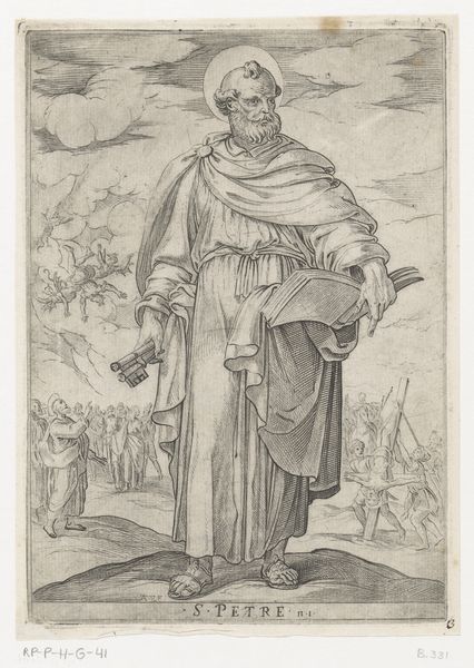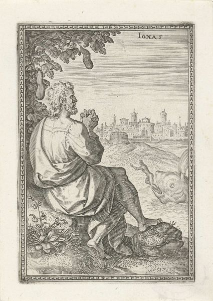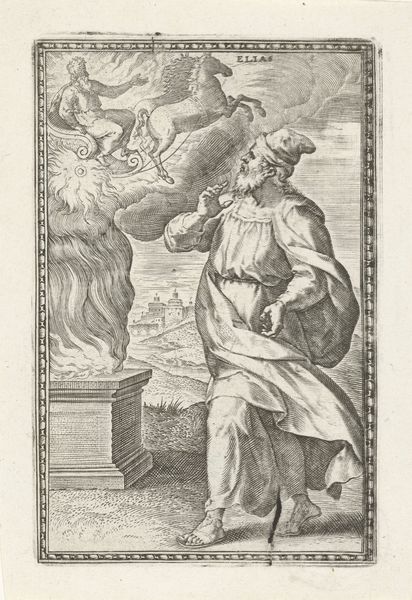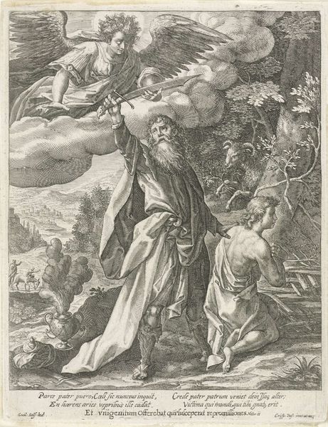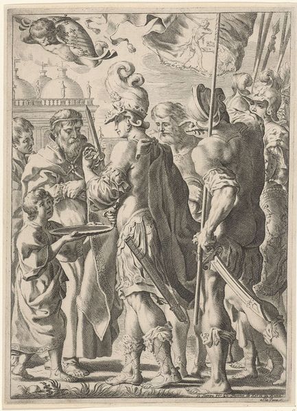 Editor: This engraving, "Winter: a King with the Four Winds," from 1568 by Lambert Lombard, feels strangely… contemporary, doesn’t it? The stark lines and that imposing central figure create this powerful sense of… well, cold, obviously, but also isolation. What jumps out at you when you look at it? Curator: Ah, yes, Lambert Lombard. He had such a curious mind! What leaps out? Well, aside from the howling wind-faces that would be quite at home in a modern cartoon, it’s that figure himself: the very personification of Winter. Do you notice how he's not just sitting there, all grumpy-like? Look closer! Editor: You’re right! He’s wearing this elaborate armor, almost scaly-looking, and he’s got this spiky crown. Is that supposed to tell us something about his power? Curator: Precisely! Lombard's weaving allegory with observation. Winter isn't just a season; it's a reign. A stern ruler. And what’s more fearsome than a ruler with power over the very elements? Notice those icy blasts issuing from the winds; that desolate, frozen landscape, the people struggling to get along... Lombard has rendered the season's bite – both beautiful and brutal! A perfect pen work of history. I find it hard to turn away. Editor: It's amazing how much feeling is conveyed with so few lines! The level of detail on that armor... It makes you think about the skill, and the meaning of the time and patience involved. It gives you pause, really. Thanks for pointing that out! Curator: My pleasure! Isn't that the best kind of art? It rewards your looking, doesn’t it, leading you down paths you never quite expected to travel. I see, and understand, Winter in a new way now.