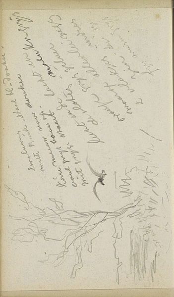 Curator: "Planten," or "Plants," from sometime between 1862 and 1864, crafted with pencil on paper by Johannes Tavenraat. It's held here at the Rijksmuseum. What’s your initial take? Editor: It feels so fleeting. Like a quick sketch grabbed from a summer afternoon. Whispers of wind and green... barely there. Curator: Absolutely. Tavenraat, who mostly worked in landscape, was devoted to realism, using landscapes to express a larger appreciation for what’s natural. His connection to art involved his participation in cultural and intellectual settings. Editor: I can see it, that impulse to catch the truth of a thing. Notice how economical the strokes are? Just a few lines to suggest texture and form. There are plants that become merely suggestion as a form for him to communicate more with his personal truth about a concept, like the beauty and fragility that lies in life. It's poetry with a pencil! Curator: These sketchbooks are important to our understanding of 19th century aesthetic movements and practices. They were central in the making of art accessible to the public—a function these books would sometimes serve directly when opened to be looked at within someone’s drawing room. Editor: Thinking about those drawing rooms… it adds another layer to the fragility. Imagine these delicate renderings, passed around, pondered, and carefully stored. Each stroke becoming a gesture of intimacy! Curator: Precisely. Art circulating through social rituals. These drawings help connect aesthetic culture, artistic practice, and social value! Editor: There’s a gentleness in its detail and form. Almost like a secret language. What if he imagined they carried an actual botanical truth—revealing more about what’s going on than is visibly perceivable at face value? Curator: Perhaps. Tavenraat creates such intimacy of appreciation. To sit so quietly and study! Editor: Well, Johannes Tavenraat's intimate whispers definitely sparked something new for me today. Thanks for unveiling a different lens!