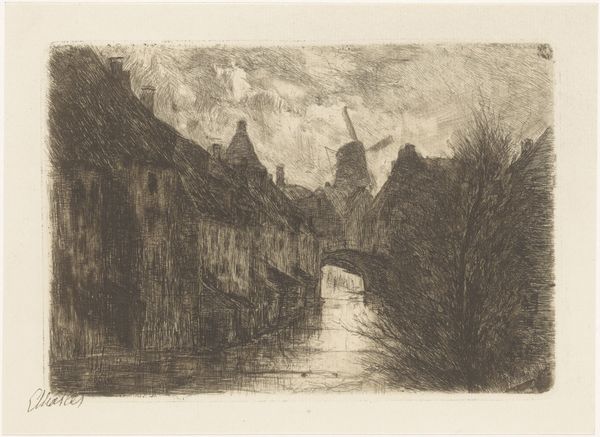Editor: So, this is "Two Figures Walking Along a City Canal" by Omer Coppens, an etching from 1896. The atmosphere is quite somber, almost dreamlike, with a strong emphasis on the reflections in the water. What do you see in this print? Curator: I see the stark impact of industrialization on urban labor. Look at the repetitive, almost mechanical, lines used to depict the buildings. Consider the printmaking process itself: the repetitive etching, the controlled application of acid. Coppens is not just depicting a city; he's showing us the *making* of that city, the labor involved. How does the materiality of printmaking contribute to this idea of the city as a manufactured, almost mass-produced entity? Editor: That's a great point about the process mimicking the industrialized subject. The reflections are very painterly and soft, almost contradicting the harsher lines in the architecture. Is Coppens maybe playing with the contrast between the organic and the industrial? Curator: Precisely! It brings forward this tension between older artisanal methods, suggested by the softness of the reflections, and the rising tide of mechanized labor responsible for these canal-side structures. The two figures are also critical. Who were these people that experienced these social tensions between man, city and water? How do we re-imagine these realities? Editor: That makes me rethink the whole scene. It's not just a pretty cityscape, but a statement about labor, production, and social change. It makes the viewing of something as commonplace as walking in the city seem complex and nuanced. Curator: Absolutely, and remember the etching technique! The metal plate itself bears the marks of labor and intervention and therefore shows a trace of production, subtly revealing these very socioeconomic underpinnings. That adds a crucial dimension to our interpretation. Editor: I see how focusing on the material processes used and the social context can give you such a different understanding. Thank you for providing such great insight.