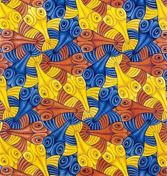 Editor: We're looking at "Fish & Boat," a lithograph by M.C. Escher from 1948. It's quite a striking image, morphing between fish and boats. What historical context can you bring to help us understand this piece? Curator: Escher's tessellations aren't just clever geometry. The post-war period saw a surge of interest in science and mathematical principles infiltrating art. Institutions and public discourse were fascinated by this intersection, which is reflected in Escher's growing popularity. The endless pattern symbolizes the search for order after the chaos of the war. Don't you think the mirroring and repetition suggests a yearning for a return to normalcy? Editor: Yes, the constant repetition feels almost like a mantra, a kind of wishful thinking for a stable world. How did this artistic style influence its reception at the time? Curator: Initially, Escher's work wasn't celebrated within traditional fine art circles. The art world at the time, particularly in the abstract expressionist scene, heavily valued unique artistic gestures over technical skill and geometrical precision. However, its accessibility to the public and appeal to scientific communities gave him an unusual, widespread popularity outside traditional venues. So it was not necessarily art institutions but math conferences and educational publications that propelled him into the broader public consciousness. Editor: That's really interesting, so its public accessibility set it apart. I suppose I was looking at it as just an interesting pattern. Curator: Precisely! His art serves as a great example of how artistic relevance isn’t just judged by museums but often constructed within social contexts. It makes you think about what determines artistic value in the first place, doesn't it? Editor: Absolutely. I’ll never see tessellations the same way again.