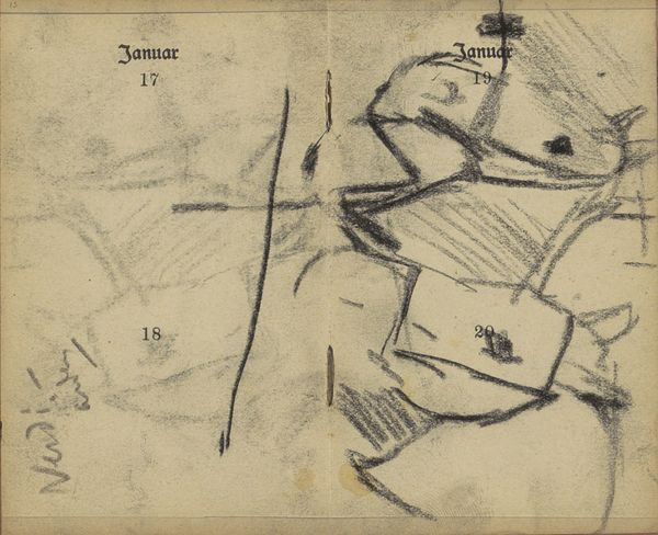 Curator: This is a drawing by George Hendrik Breitner, titled "Studie, mogelijk van een figuur voor gebouwen," likely created between 1881 and 1883. It resides here at the Rijksmuseum. Editor: My immediate reaction is...ethereal. The pencil lines are so light and fleeting; it feels more like a suggestion of form than a defined structure. Almost ghostly, you know? Curator: Yes, "ghostly" captures something of its unfinished quality. As a study, we see Breitner working through the relationship between form and function. It looks like an early sketch in his process, an exploration of an idea destined for a more solid structure. What might such architectural forms have symbolized to Breitner, beyond their practical purpose? Editor: It seems like it comes from a personal sketchbook, right? Considering the amateur pencil strokes and minimal shading, it reflects an explorative artistic style. I think that he's likely looking at existing building structures and deconstructing them back into simple lines to further abstract his own vision for new buildings. Curator: The sketchbook aspect is important, I think. There’s a raw intimacy to the drawing – we are witnessing Breitner at work, grappling with concepts. It lets us see a glimpse into the labor and material process of building art, so it makes sense that you noticed its physicality. It reminds us that even the grandest structures began with an idea, a line on paper, a process of trying, abandoning, and modifying based on material conditions. Editor: I do wonder how the social context influenced Breitner, in the late 19th century. It shows how artists explored materiality, even when tasked with the monumental. Perhaps Breitner’s social context influenced his process of building and experimentation here? The Industrial Revolution really influenced material processes within all the arts, didn’t it? Curator: Undoubtedly. Consider that drawings were crucial not just for architectural design, but also for social transformation. What symbolic importance could there have been for drawing particular things at that time? This seemingly slight sketch gives us a more complete view. Editor: It gives food for thought regarding how simple means become symbolic works with time. The interplay of a raw material like pencil on paper with greater society is intriguing. Curator: A reminder that every stroke tells a story, or perhaps many stories, connecting the artist's hand to the grand designs of their age. Editor: Right, the simplest strokes lead to cultural and material insight.