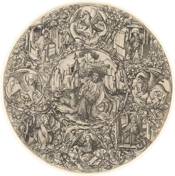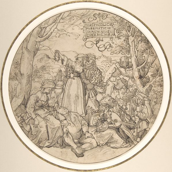 Lucas van Leyden created this circular engraving, "The Betrayal of Christ," in the early 16th century, a work dominated by intricate lines and a dynamic composition contained within its round frame. The artist masterfully uses the circular format to compress the dramatic scene. Christ is centrally placed but is being seized by soldiers whose diagonal spears create a sense of chaos and aggression. The tight composition focuses attention on the moment of betrayal, the expressions and gestures of the figures heightening the emotional tension. The use of line is remarkable; fine, closely packed lines create shadows and volume, while sparser lines define the background landscape with a castle in the distance. This contrast in line density not only adds depth but also emphasizes the turmoil of the foreground action. The circular format itself challenges the conventional rectangular picture plane, suggesting a world in motion, reflecting perhaps the ceaseless cycles of human suffering and redemption. The viewer is invited to contemplate the historical moment and its enduring relevance through a complex interplay of form and content.