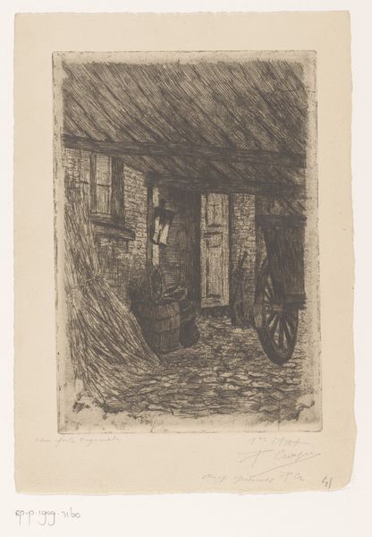 Curator: Immediately, I’m struck by the high contrast, almost stark presentation. The sharp lines create a distinct and slightly somber mood. Editor: Indeed. This woodcut, "Houten boerenschuur," or "Wooden Barn," by Harm Ellens, dates to 1924 and offers us a peek into a rural past. Note the bold use of light and shadow to define the rustic architecture and surrounding landscape. Curator: That rustic element is precisely what captures my attention. The barn itself seems burdened with years of untold stories. There’s a poignant symbolism here, don't you think? This humble structure represents resilience, perhaps even endurance against the relentless forces of time and nature. Editor: Absolutely. Woodcuts, particularly those with this level of detail and expressiveness, often speak to the lived experience of a community. During this period in the Netherlands, many artists explored themes of rural life, perhaps idealizing or documenting a way of life they felt was slipping away in the face of modernization. The barn is more than just a building, it's a cultural artifact, embedded with the labor and hopes of the people who used it. Curator: The deliberate lack of human presence emphasizes that solitude. It’s as if the barn stands as a silent sentinel. Consider, also, the dense foliage that appears to crowd the structure, imparting both refuge and a slight feeling of oppression. Editor: I agree. The formal aspects contribute to the themes it evokes. Ellens uses the graphic, textural qualities inherent to the woodcut medium to full effect, mirroring the weathered surfaces he depicts. I imagine viewers in 1924 responded strongly to these images of authentic, ‘unspoiled’ rurality. Curator: Seeing it now, a century later, evokes both a longing for simpler times, perhaps a touch naive, and an appreciation for the lasting power of such direct visual language. It shows how cultural memories persist, echoing through art across generations. Editor: For me, Ellens’ "Houten boerenschuur" demonstrates how even seemingly simple scenes offer potent commentary on shifts in Dutch society during the interwar years. I will not forget this artwork.