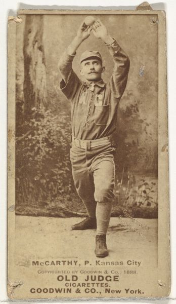 Curator: The artwork before us is a baseball card featuring Joseph Brook "Joe" Gunson, a catcher for the Kansas City Cowboys, from the Old Judge series issued circa 1888. Goodwin & Company produced this card as part of a larger set distributed with Old Judge Cigarettes. The print employs an albumen process. Editor: There’s a definite charm to it, a certain immediacy. I’m drawn to the monochromatic palette. The subtle sepia tones soften the intensity of the action pose. The off-center composition adds a dynamic element. Curator: It’s fascinating how commercial ephemera like this sheds light on the culture of the time. Consider the production: mass-produced images tied to the tobacco industry, aimed at a growing consumer market. The use of albumen printing also signifies the era’s photographic processes and the labor involved. Editor: Yes, and visually, I appreciate how the composition leads your eye. Gunson's pose creates diagonal lines – from the outstretched arm holding the ball to his grounded stance. This creates tension and movement within the static image, even suggesting a snapshot from life. Curator: This tension is reflective of broader socio-economic dynamics at play. The commodification of leisure through sports imagery is intimately tied to emerging industries and evolving consumer habits in late 19th-century America. How these athletes were presented says so much about prevailing ideologies of labor and leisure. Editor: For me, this piece transcends its original context. It speaks to universal themes: the beauty of athleticism and the desire to capture fleeting moments in art. The focus and the blur are like any impressionist piece, celebrating form and color to communicate an experience, Curator: Certainly. Understanding these early baseball cards provides invaluable insight into the evolving commercial landscape. These images, originally designed to sell cigarettes, are now studied in museums. Editor: Ultimately, this card embodies the transition in photographic styles and tastes of the late nineteenth century, preserving on its modest stage a fragment of Gunson's prowess and the cultural moment of baseball's burgeoning popularity.