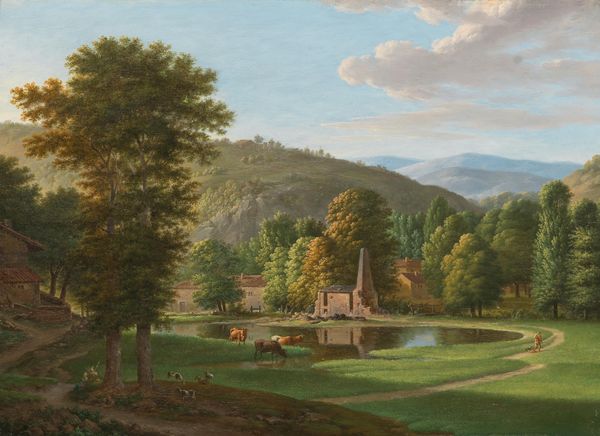Editor: So, this is *Lake George and the Village of Caldwell*, painted between 1847 and 1850 by Thomas Chambers. It's an oil painting, and I find its blend of realism and slightly flattened perspective really striking. How do you interpret this work, especially considering its historical context? Curator: Well, beyond its surface appeal as a pleasant landscape, let’s consider what Chambers might be silently protesting, or perhaps more accurately, who he's centering through landscape. Think about whose gaze this picture invites. This wasn't just about capturing the beauty of the American landscape; it was about defining who belonged, and who benefited, from the concept of the ‘American Dream’ at that time. Are there any figures visible that may be indentured? Editor: I don’t see anyone that could be identified in that manner. I do see sailing ships which suggest commercial traffic. But if this painting excludes some individuals or groups, how can we even know for sure? Curator: Exactly! That absence is telling. We can read these landscapes as expressions of nationhood that are as much about inclusion as they are about very specific, coded forms of exclusion. Consider who isn't represented—Indigenous people displaced from that very land. Think about the laborers who enabled leisure activities depicted on the lake. Are they present in the frame? No. Editor: That's a powerful point. So, reading it as a sort of… purposeful omission, almost a political act, even within its seemingly innocent presentation? Curator: Precisely. It encourages us to challenge what is being normalized through representation. We begin to see the silent power structures. The concept of manifest destiny comes to mind…the paintings sell the dream that omits the original inhabitants… Editor: This makes me view it very differently. What I initially perceived as just a pretty landscape now feels much more complicated. Curator: And that complexity, that discomfort, is where the real dialogue begins. It is this historical understanding, viewed through the intersectional lens of social injustice that brings these artworks into contemporary critical discussion.