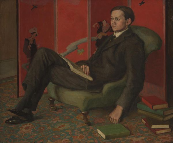 Curator: Thomas Eakins’ portrait of Frank Jay St. John, painted around 1900, catches the eye. Look at the pose; it suggests both ease and perhaps a touch of melancholy, doesn't it? Editor: Immediately, I’m struck by the man’s detachment. The way he's positioned, leaning back, leg crossed, almost feels performative. Who was this St. John, and why this presentation of controlled disinterest? Curator: Good question! As an artist, I find myself drawn to the nuances of light and shadow playing across his face. Notice how Eakins uses subtle brushstrokes to capture the texture of his jacket and the patterned rug beneath the chair. He must have spent quite a while on that rug, the painting style is amazing. Editor: It is quite the rug! Beyond the skill, though, I see a reinforcement of class and power. The rug, the tailored suit, even the casually placed hat… they’re all signifiers of a certain societal standing. What statement does the artist make by portraying him within these boundaries of wealth? Curator: Or perhaps a subtle dig? He appears relaxed, but there's a certain tension in his eyes. And that dark suit and his dark hat, I wonder, do they echo that melancholy I feel? There are all sorts of theories as to whether Thomas Eakins painted with sympathy or the contrary. Editor: That "tension" may reveal the restrictions placed on men during this era, which this image reproduces and almost venerates. We see an idealized version of manhood tied to status and reserved emotion, something we continue to unpack and resist even today. I think his hand holding that hat on his leg feels somewhat theatrical. Curator: That's quite interesting to note! The "theatricality" almost feels too studied somehow. It is not really natural! And that background does not provide us with much information; he has his back to a wall, not against a colorful landscape or anything that tells us more about who he is. Editor: Right! Eakins gives us just enough information, withholding, or perhaps obscuring St. John’s complete self. He offers a meditation on masculinity during a moment of massive transformation. How fascinating to consider this piece as both a marker of and an intervention into that historical turning point. Curator: Looking closely and listening to what you are saying has really made me consider this as more than a masterful exercise in Realist portraiture! There is an undercurrent that moves this piece away from simple representation, towards cultural observation. Thank you for providing us with some useful food for thought!