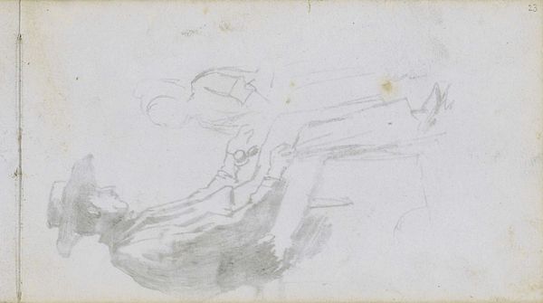 This sketch, “Zittende man met een hoed,” by Johan Hendrik Weissenbruch at the Rijksmuseum, is rendered simply in pencil. The composition is dominated by diagonal lines that form the man’s posture as he sits, leaning back, with a woman standing behind him. The artist’s concentration on line and form, rather than detail, creates a sense of immediacy, almost as if capturing a fleeting moment. Weissenbruch here uses the structural elements of line to imply form and space, and this directness aligns with a broader artistic interest in depicting modern life without idealization. The structuralist approach allows us to consider not just what is depicted but how the depiction itself conveys meaning. Note the sparse use of shading. It is a semiotic device, offering clues about the subject's psychological space. The sketch challenges the conventional portrait's aim for accuracy, inviting reflection on the artistic process itself and the representation of everyday experience.