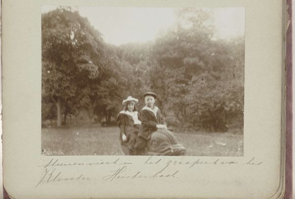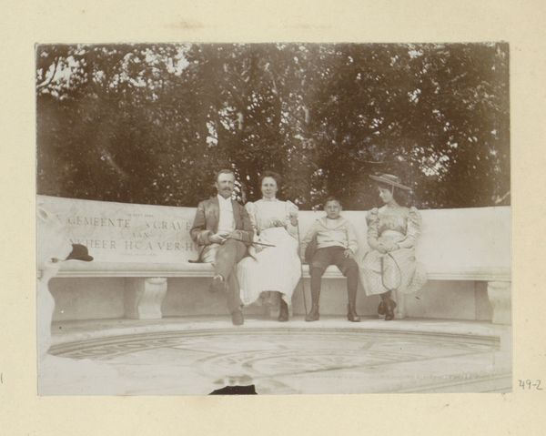 Editor: So, here we have a gelatin silver print from before 1894, "Theodoor, Annie, Way en Noesy op de Cremerbank in de Scheveningse Bosjes" by Hendrik Herman van den Berg. It's a formal family portrait in what appears to be a park, a pretty typical 19th-century shot, I suppose. What else is there to it? Curator: Typical, perhaps, on the surface. But let’s think about the context. Late 19th century… Photography, still relatively new, becomes a tool for memorialization, but also for constructing a particular image of the self, the family. Notice the deliberate composition: the subjects formally arranged, almost staged. It is a carefully crafted presentation of bourgeois respectability. Editor: Staged, yes. The subjects even seem a little stiff and unnatural, the way they're seated and posed. What does it signify? Curator: Precisely. Consider the power dynamics inherent in this 'family portrait'. The male figure occupies the central position, subtly asserting patriarchal dominance. The women and children are positioned around him, almost framing him, but he’s undeniably the center. How might gender and class intersect here, in terms of representation? Editor: I hadn’t considered the composition in terms of power. So, it’s not just a simple portrait, but a visual statement about social roles? Curator: Exactly. Think of pictorialism too – blurring photography with art by manipulating the image in a way to have photography gain more artistic validation. It's about reinforcing societal expectations, projecting an idealized image of domesticity and family unity, carefully managing public image and representation in a quickly modernizing world. Who benefits from this constructed narrative? Editor: Wow, I never thought about it that deeply. It’s more than just a photograph, it’s a cultural artifact loaded with meaning. Curator: Absolutely. Seeing it as an artifact gives us entry to so much about class, gender and history.