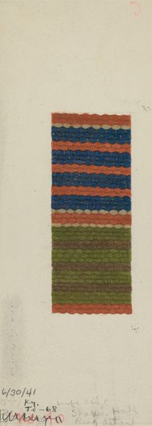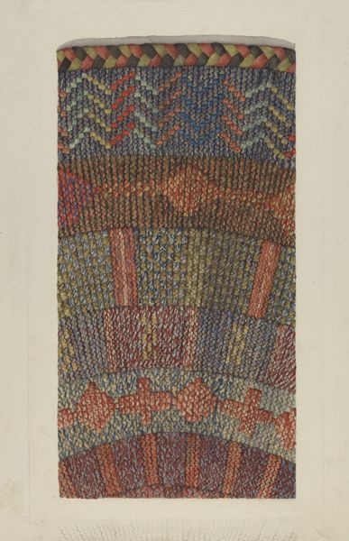 Curator: This lovely watercolor and pencil drawing from around 1936 is titled "Shaker Rug" and is attributed to Alice Stearns. It offers a detailed rendering of what appears to be a hand-woven rug or textile. What strikes you most when you first see this piece? Editor: It feels like a secret code! You know, those intricate woven patterns almost look like something you could decode if you looked at them long enough. Like it is charged with unspoken things. It has the warmth of the domestic, yet also possesses an austere charm. Curator: That’s a beautiful observation. Considering the Shaker association, that austere charm is quite intentional. The Shakers were known for their commitment to simplicity, utility, and quality craftsmanship. The rug, as a domestic object, carries echoes of these core values. Pattern repetition was essential, and can be a reflection of Shaker beliefs about order and purpose in daily life. Editor: The way the different sections are handled is lovely too. You have a vertical stripe with the color gradation alongside that chunky zig-zag. There is something deeply calming about that rhythm. It seems humble, and also bold in its own way. Curator: Indeed. There is also something to be said about the very act of Stearns creating this image of the rug, because what are we celebrating? The artistry of the rug, or is it the image making by Stearns? Or perhaps both, together! I'm captivated by the image’s subtle hues – that restrained palette is characteristic of Shaker design, but also perhaps constrained by the limits of dyes that would be available at the time? Editor: Right? It feels like it opens a door to the past but refuses to over explain things. What could we ever truly understand about those who lived before us? At best, perhaps we might get only hints. Like reading tea leaves... or textile patterns. Curator: Ultimately, this work beautifully marries the physical object, in this case, a Shaker rug, with the act of its reproduction. The artist gives permanence to a design and its cultural context, adding a new dimension of artistic merit through close observation, documentation and illustration. Editor: It makes me think about how we record the small details in life and imbue our spaces with memory and presence. It is almost a portrait...of an ethos!
