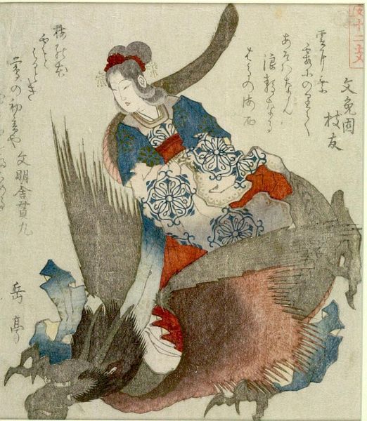 Editor: This small print by Hokusai, "Prawn and Other Offerings," presents a curious arrangement of objects. The striking red prawn is what grabs your eye first. What do you make of this unusual composition? Curator: Note how the artist has meticulously rendered the prawn's form and texture, set against the contrasting geometric shapes of the other offerings. The interplay between organic and inorganic forms creates a visual tension, wouldn't you agree? Editor: It does. It’s like he's playing with texture and form, but is there any symbolic meaning you can extract from this arrangement? Curator: The artist employs color and form to direct the viewer's gaze, highlighting the intrinsic elements. This work seems to be a study in the beauty of structure and the artist's deft manipulation of form and line. Editor: Fascinating. I hadn't considered it as a formal exercise. Curator: Consider how the artist uses the interplay of color to create balance and visual interest.