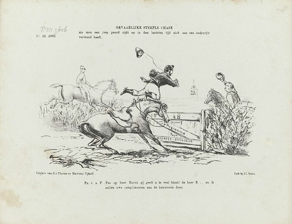Editor: This is "Spotprent op de ultramontaanse protesten tegen de viering van Heiligerlee, 1868," a drawing in ink on paper by Johan Michaël Schmidt Crans, made in 1867. It looks like a political cartoon. I see some figures taking aim at a target, and it has quite a critical mood. What do you see in this piece? Curator: This caricature offers a glimpse into the religious and political tensions of the Netherlands in the late 19th century. The ultramontane movement sought to exert papal authority. Notice how the artist depicts them engaged in shooting practice? What could that suggest, in this context? Editor: Perhaps that they are attacking or undermining some aspect of Dutch culture. There's a banner that says "Dietscbe Warande," which I think is something Dutch. And I see some writing around the target… Curator: Precisely! The target symbolizes the celebration of the Battle of Heiligerlee, a significant event in Dutch history representing independence from Spanish rule. So the cartoon is commenting on an internal political debate by portraying religious conservatives aiming to rewrite the Dutch national narrative. How might feminist theory help unpack what's going on here? Editor: Well, the marksmen seem to all be men. Maybe there is a masculine need to dominate, to rewrite the history, or an effort to undermine anything not tied to their belief system. Curator: Exactly. This image shows how power is negotiated, visually and culturally. I think analyzing such caricatures shows how art plays an active role in shaping historical consciousness. Editor: This makes me look at political cartoons with new eyes, thinking of them as active agents in cultural discourse and understanding how gender can play into that. Curator: And it reveals how critical visual strategies are to understanding history.