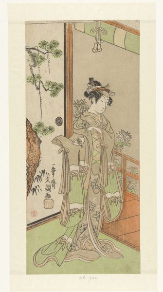 Ippitsusai Bunchō created this print of the actor Sawamura Sojuro I in an unidentified female role around 1770, using woodblock printing on paper. The composition is dominated by a full-length figure, set against a neutral background punctuated by architectural and floral elements. The delicate lines and subdued colors of the print create a serene yet somewhat theatrical atmosphere. Here, Bunchō masterfully plays with the semiotics of gender and identity. The actor, a male portraying a female role, challenges fixed notions of gender. The intricate patterns on the kimono, the carefully arranged hair, and the graceful pose are all signs that contribute to the construction of this ambiguous persona. The artist seems interested in deconstructing traditional representations of both masculinity and femininity. In doing so, Bunchō’s print invites viewers to question the cultural codes and performative aspects of gender, suggesting that identity is not fixed but fluid and theatrical.