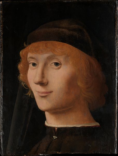 Editor: We’re looking at Antonello da Messina's "Portrait of a Young Man," painted around 1475-1480. It’s an oil painting, and I'm immediately struck by the subject's intense gaze. It’s quite unnerving and very direct. What do you see in this piece beyond the surface? Curator: The intense gaze is key. In Early Renaissance portraiture, that directness breaks from earlier traditions. We have to consider the painting’s role within the rise of individualism during this period. How does the painting, specifically the subject's clothes, signal his socio-economic standing? Editor: He's not dressed elaborately, but his clothes seem neat. Perhaps middle class, on the rise? It feels intentional, like he wants to project a certain image, maybe to subvert expectations of aristocracy, and to express individuality through the face. Curator: Precisely. Antonello was working in a time of burgeoning trade and humanist ideals. These portraits weren't just about representing the wealthy. Think about the politics of representation here: who was given a voice, a face, during the Early Renaissance? What stories were excluded? And even what ideals of beauty where preminent in Italian portraiture. Editor: So it’s not just about aesthetics but about power and access. Curator: Exactly. The sitter’s gaze challenges the viewer to acknowledge his presence, his individual existence within a changing social structure. What can art tell us about the values of the society? Editor: It really highlights the importance of looking beyond the visual appeal and thinking about the context in which it was created and what societal shifts it reflected, or perhaps, critiqued. Curator: Indeed, a good portrait invites questions beyond appearance.