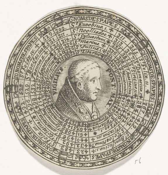 Curator: Here we have an engraving dating from the late 17th to early 18th century. It's titled "Penning met het portret van Dirk VII en de namen van de graven van Holland," featuring Dirk VII. Editor: It strikes me immediately as something of a cultural artifact, beyond its aesthetic value. A face encircled by names – almost like a regal family tree frozen in ink. I sense a deep preoccupation with lineage and historical continuity. Curator: Exactly. The means of production here—engraving—allowed for relatively widespread distribution of these commemorative or didactic objects. The controlled lines and precise lettering point to the skill and labor involved, emphasizing the coin or medal format, a popular way to mass-produce and distribute iconic representations. Editor: And the symbolism reinforces that. The portrait sits centrally, anchoring all these names, connecting them, perhaps legitimizing them. There's something circular and almost incantatory in how the names spiral around him with small symbols beside them. The circular format suggests cycles of power, the recurrent nature of history perhaps? Curator: Possibly, but the deliberate ordering of these names is what gets me thinking about how it functions in relation to specific audiences. The work might engage with anxieties about succession or challenge interpretations about claims of inheritance prevalent within specific social circles. Editor: A fascinating observation. Looking at this now, it strikes me how those crown icons mark those rulers with great relevance or succession highlights. It creates an alternative emphasis, guiding the viewer through a curated historical narrative. And notice those other tiny, almost skeletal figures amongst the listed names? Macabre additions. Curator: Yes! And these repetitive forms highlight that even printed ‘art’ had material limits. The etching likely originated to record, distribute, or possibly shape, narratives about lineage to legitimize claims during specific periods. The texture comes from the marks of the burin on the metal plate – which, when inked and pressed, produce this work of reproducible authority. Editor: Looking again, what resonated initially as solemn now carries the weight of constructed legacy, etched carefully into material form, making history a commodity of sorts. Curator: Precisely, and recognizing this changes how we interpret the historical document. Editor: Indeed. Now, I view it with fresh eyes—a meticulously constructed statement about history and power.