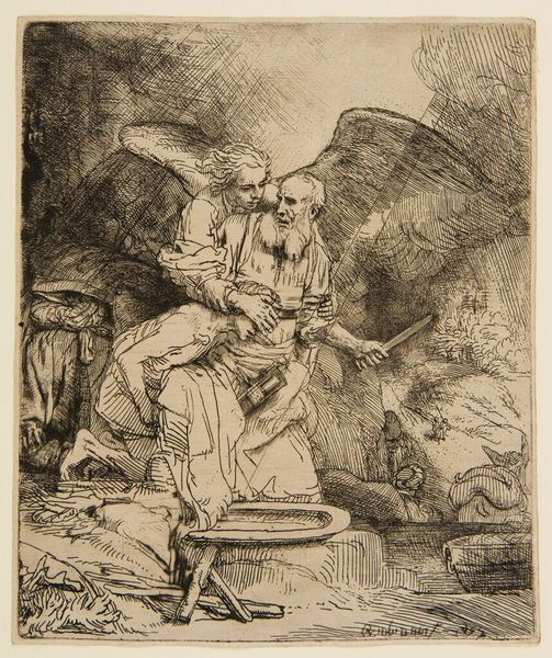 Curator: Kneeling King with Two Angels, made around 1515 by Matthias Grünewald, captures the period’s religious sensibilities. Done in charcoal, it prefigures many elements characteristic of Northern Renaissance art. Editor: It’s stark, almost austere, isn't it? The muted tones emphasize a palpable sense of penitence—or perhaps weary authority. The figures appear caught between worlds, heaven and earth perhaps. Curator: Yes, and consider the symbolism at play. Angels often bridge the divine and mortal realms, guiding earthly figures. The kneeling king, perhaps a ruler seeking divine sanction or forgiveness. The inclusion of the orb indicates worldly power… Editor: Worldly power tentatively offered up. The way Grünewald deploys charcoal, though—it's almost proto-Surrealist! These swirling forms, dissolving edges… it challenges the linear precision typically associated with Renaissance drawing. See the intentional blurring… Curator: Indeed. But beyond pure technique, Grünewald seems keen on depicting humility. Monarchs derive legitimacy from faith, even bend a knee to the Almighty, seeking favor or absolution. The imagery is prevalent throughout the Middle Ages and the Renaissance. Kings and their advisors are perpetually caught in the dance of morality and power… Editor: And the angels are so delicately rendered... Are they real or aspects of his inner state? And what about the composition itself? Notice how all of the sightlines seem to focus in and up on the center figures: The king is only one piece. Is this king real? He feels very ephemeral. Curator: Well, Grünewald understood something about kingship. Even at its height, it rests on something ethereal. Power is real but can slip away easily and faith may prove most durable of all. Editor: Hmm, and even in its unfinished state, the play of light and shadow provides an interesting, open meditation of spiritual authority… Curator: Definitely something to sit with for a long while… Editor: Indeed, very profound in its simplicity…