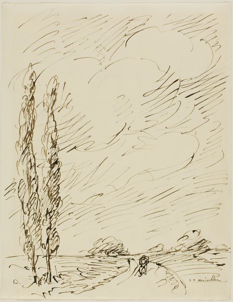 Pierre Laprade created this drypoint print, "Two Figures between Trees," using a sharp needle to directly scratch an image onto a copper plate. The fine lines, almost like a sketch, show the immediacy of the artist's hand. Unlike etching, which uses acid to bite into the metal, drypoint relies entirely on the physical pressure of the tool. This creates a burr, a ridge of displaced metal alongside the incised line, which catches ink and results in the velvety, slightly blurred quality we see here. This printmaking technique allowed for multiple reproductions, democratizing art. The labor-intensive process of creating the plate contrasts with the relative ease of pulling prints, raising questions about the value of the original artistic gesture versus the accessibility of the image. Laprade’s choice of drypoint speaks to the evolving relationship between artistic skill, mechanical reproduction, and consumption in the early 20th century. By focusing on process and materials, we gain insight into the broader context of artistic production and its connection to society.