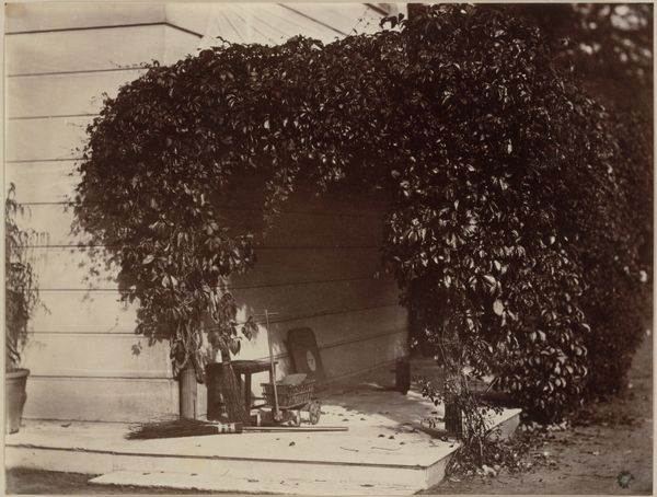 Editor: This photograph, "[Rustic Building with Man under Trellis]" by André Giroux, dating from around 1851-1855, presents a building partly obscured by lush foliage. I'm struck by how soft and timeless the image feels. What layers of symbolism do you see at play here? Curator: This image speaks to the enduring human connection with nature and shelter. The building, solid and aged, represents permanence and perhaps a rooted history. Notice how the trellis, covered in vines, softens the rigid structure. Editor: I do. There is this very pronounced contrast, so you have that architectural presence alongside these natural forms; it gives off the impression of nature reclaiming the built world. What would you read into that? Curator: The tension you perceive between nature and architecture could symbolize a broader commentary. Does nature dominate, or does the structure hold its own? Think about the period, a time of rapid industrialization, urbanization and the birth of environmentalism; images like these reflected both anxieties about this shift and yearning for a more natural existence. Editor: So, the overgrown trellis could stand for the allure and inevitability of the natural world, contrasting against rigid societal development? Curator: Precisely. The man under the trellis is nearly swallowed in shadow. What meanings could reside in that shadowed form? Editor: It could evoke vulnerability, the individual dwarfed and protected, yet almost concealed, by nature. Is the image cautionary or celebratory? Curator: Both. It’s a dialogue, not a decree. Editor: I hadn’t thought of it that way. Thanks, seeing it through that lens clarifies its depth. Curator: My pleasure. Each viewing will add to your own understanding.