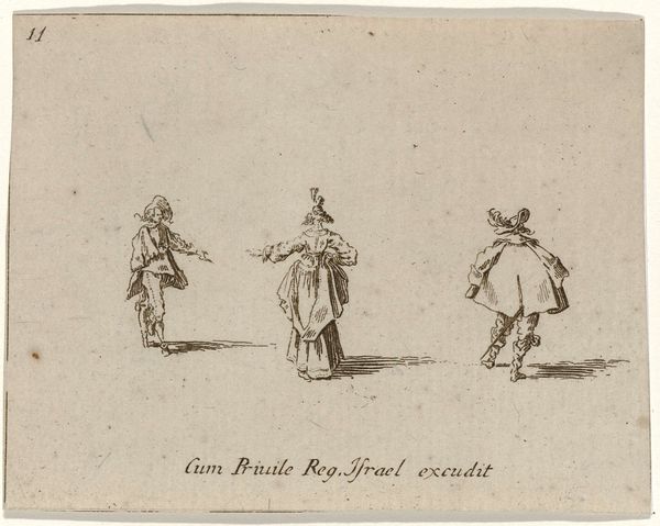 Curator: Jacques Callot's miniature etching, "Woman with a Short Fur-Trimmed Cloak, Between Two Men," offers a glimpse into 17th-century fashion and social dynamics. I find it terribly romantic. Editor: Romantic, perhaps, but I'm struck by the mechanics of its production; think of the copperplate, the acid, the press, the labor all involved in creating such a small, reproducible image. Curator: Yes, and look how Callot uses line—it’s almost like he's breathing life into these figures. The way he suggests the texture of the fur, the sheen of the fabric... Editor: The fur trim is an interesting detail—a status marker dependent on trapping, trade, and textile work. These aren't just figures; they're products of specific material conditions. Curator: It is a dance of light and shadow, isn't it? Almost as if the artist had a premonition of the magic that images can create. Editor: And the very act of etching allowed that magic to be disseminated widely, shaping perceptions and fueling desires, wouldn’t you agree? Curator: Absolutely, it's enchanting to contemplate the lives, real and imagined, that this image touched so long ago. Editor: Indeed, and to consider the complex network of making and meaning that even the smallest artwork embodies.