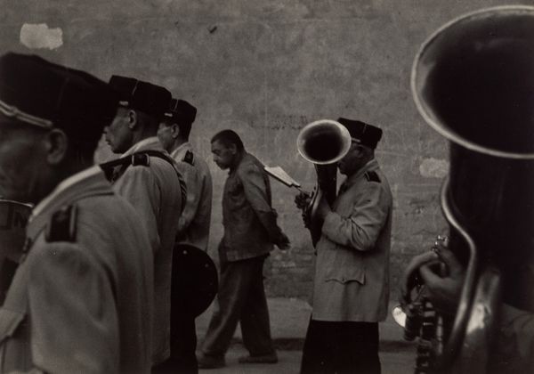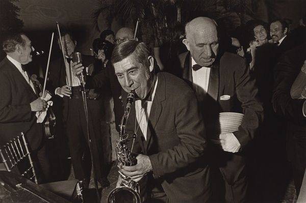 Robert Frank’s gelatin silver print, *Band, convention hall—Chicago*, captures a moment in time, a slice of life, with a directness that feels both casual and deliberate. The greyscale palette is rich, with deep blacks and nuanced grays creating a sense of depth and texture. Look at the way the light catches the metal of the trombone, or the way Frank captures the different tonal variations in the mens suits. It is about the process of noticing, of recording, of distilling a complex scene into a series of tones. The composition is a bit chaotic, with people and instruments crammed into the frame, which kind of echoes the cacophony of a convention hall. Frank’s work, especially *The Americans*, is like a visual diary of his wanderings, full of fleeting encounters and quiet observations. It reminds me a bit of Garry Winogrand’s street photography, that same sense of being in the thick of things, capturing life as it unfolds. Ultimately, Frank’s photographs are invitations to see the world a little differently, to find beauty in the mundane, and to embrace the messy, imperfect nature of reality.