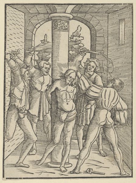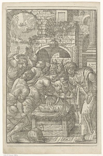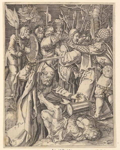 Editor: This is Mario Cartaro’s "The Entombment," a print from 1567. It’s such a tightly packed scene, almost claustrophobic, with all these figures surrounding what I assume is the body of Christ being placed in the tomb. How would you begin to interpret this piece? Curator: Note first the pronounced use of line. Cartaro masterfully employs dense, cross-hatched lines to generate volume and shadow, creating a deep and intricate texture across the surface. Do you notice how the density of lines in the upper portion of the print contributes to a sense of overwhelming grief and visual weight? Editor: Yes, absolutely. And how the stark contrast between light and shadow intensifies the drama of the moment. Curator: Precisely. Further examine how Cartaro arranges the figures, a complex choreography of bodies tightly woven together. This arrangement emphasizes the emotional intensity, creating a scene that feels both intimate and overwhelming. Consider the figure with his back to us: how does that impact the viewer’s reading? Editor: I hadn’t thought about it like that, but the figure blocks us from seeing the whole scene. It feels intentional. Is the way Cartaro uses perspective also significant? It almost feels distorted. Curator: Indeed. The lack of clear spatial recession, a hallmark of Mannerism, compresses the scene and enhances the feeling of unease. The varying scales of figures further complicate the visual space, drawing attention to the artificiality of the composition. The emphasis on formal elements over naturalistic representation is key here. Editor: This deep dive into the formal elements really illuminated how the piece’s emotional intensity is achieved. I appreciate how breaking it down shows how effectively Cartaro constructed the scene. Curator: It is through meticulous consideration of these structural components—line, composition, and spatial ambiguity—that Cartaro conveys the profundity of this somber narrative.
