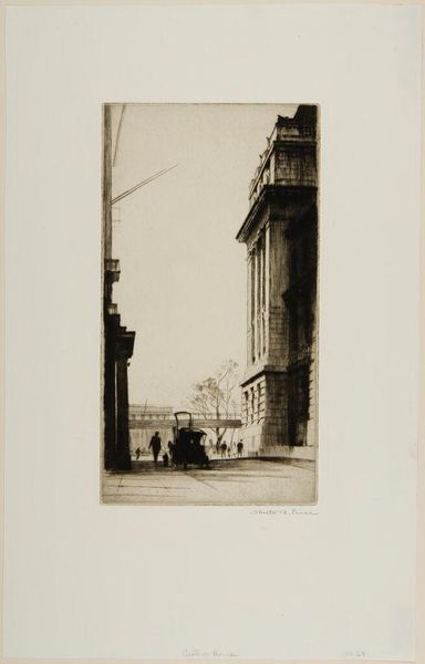 Editor: This is Samuel Chamberlain’s “Summer Street, Marblehead.” It’s a beautiful print, and I’m immediately struck by how it captures the quiet stillness of a small town. What do you see in it? Curator: Beyond the idyllic scene, I see a constructed image of Americana. Chamberlain romanticizes small-town America, likely appealing to a specific demographic and reinforcing a particular narrative. Who is included in this vision, and perhaps more importantly, who is excluded? Editor: That's a perspective I hadn't considered. I was focused on the aesthetic appeal. Curator: It’s easy to be drawn in by the visual charm. But consider how art can perpetuate certain power structures and societal norms. This image becomes less about the town itself and more about the idea of it. Editor: So, it's about questioning the narrative being presented? Curator: Exactly. By questioning whose stories are being told, and whose are being left out, we can start to see the art in a broader cultural context. Editor: I’ll definitely look at art with a more critical eye now. Thanks!