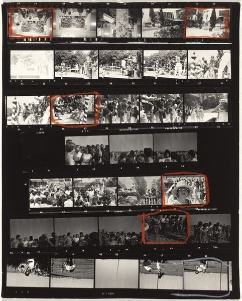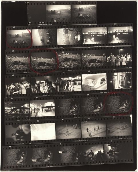 Curator: Okay, let’s dive into Robert Frank’s "Venice, Italy 7" from 1964, a gelatin-silver print. Editor: This piece, part of a contact sheet, offers several glimpses into Venice. There is the Lido crowd. What I find immediately striking is the candid and documentary nature. It makes me wonder about the story behind these captured moments. What do you see in this work? Curator: Absolutely. What intrigues me here is how Frank positions himself not merely as an observer but as a commentator on leisure and social stratification within Venice. Look at how he juxtaposes images of affluent individuals sunbathing with those of bustling crowds. It feels as if he's pointing to the disparities coexisting within this supposedly idyllic setting. How does that reading resonate with you? Editor: That tension is very compelling! It makes the sunbathers almost appear alienated. This isn't simply about picturesque Venice; it hints at something deeper about class and privilege. The images also show us the work of being on holiday, posing, the presence of cameras that is easy to forget today when we snap a hundred shots to select only one to post. Curator: Exactly! This is Frank challenging the romanticized narratives we often associate with travel and tourism. How might these snapshots, each telling its own micro-narrative, come together to form a larger commentary on post-war European society? Are we just seeing fragmented moments or something more? Editor: Maybe it’s the choice of images he circled? There is one on the top right that shows people posing in bathing suits with Aperol bottles behind them; then a crowded beach full of bodies, an arts event. The circled ones say a lot! Seeing these photographs today reminds me how images shape narratives. Curator: Precisely! What do you take away from our conversation, especially in our contemporary context? Editor: It underscores how photography, even in seemingly candid shots, is deeply implicated in constructing narratives about society, class, and even ourselves. Frank reminds us that seeing is never neutral. Curator: Well said. And it demonstrates how even images from the past can offer piercing insights into our present moment.